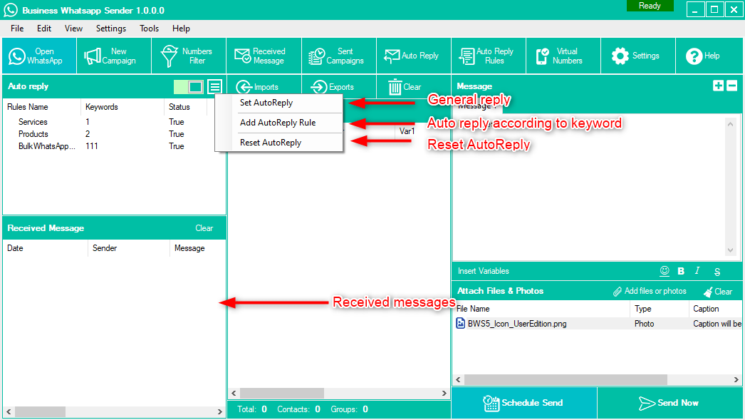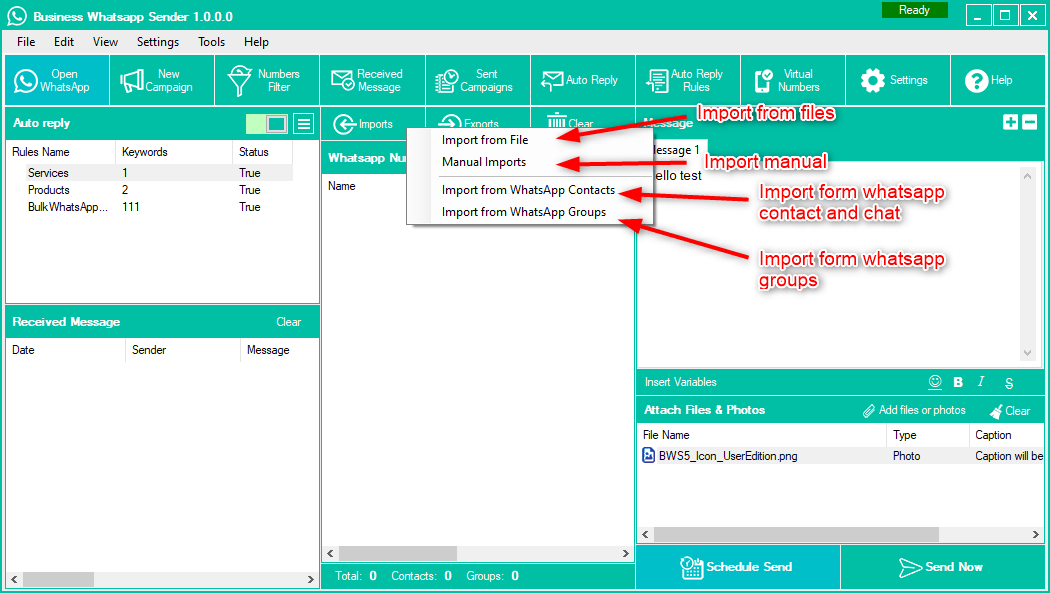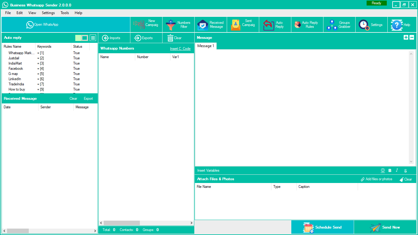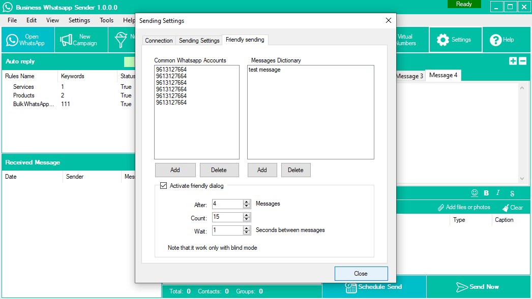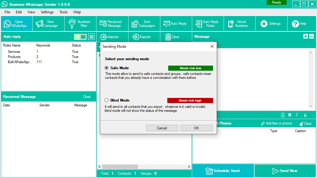 Dual Mode Sending Features (Safe Mode & Blind Mode), Filter Business & Regular Whatsapp Number, Fetch Contact From WhatsApp Contact, Sending Multi-Files With A Caption, Set Auto-Reply With Photos And Files, Set Auto-Reply Rules Related To Keywords With Photos And Files, Multi-Language Support, Safe Mode Sending(No Number Blocking), Fast Number Filter, Multi-Message Spin Tags And Other Options, Campaign Report Generator, Import From Excel, CSV, And Text, Advanced Settings For Sending, Advanced Internal Dialogs, Connection Speed Control, Sending Customized Message, Schedule Sending, Delay Between message